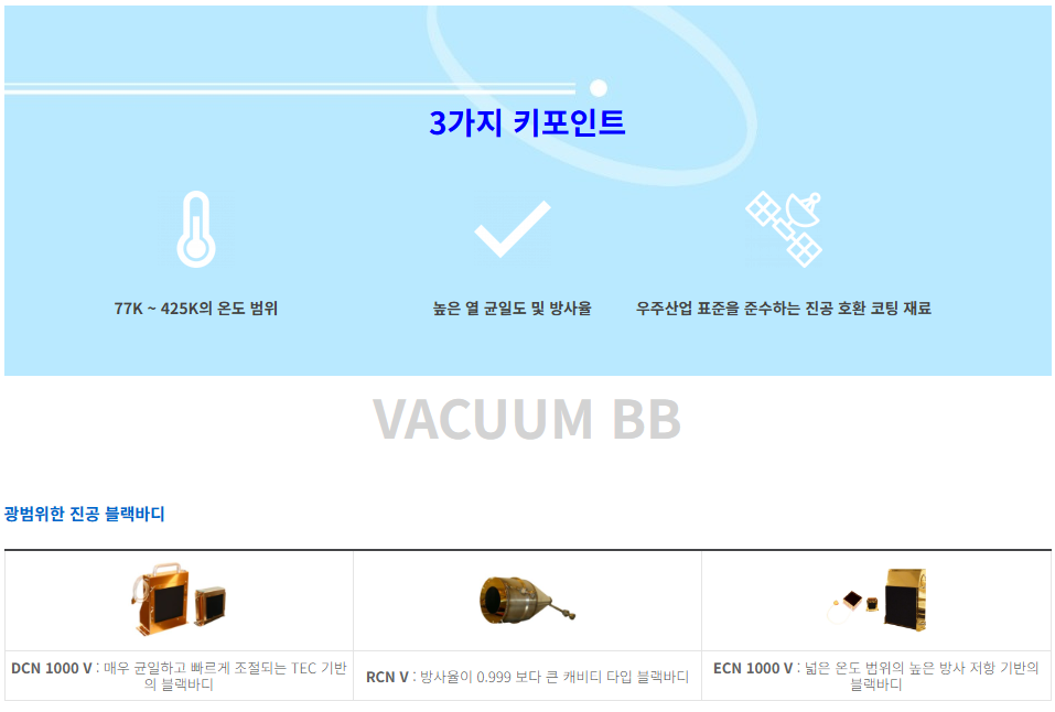 VBB는 기존에 쓰이던 기준급 블랙바디 소스의 성능과 고급 기능을 결합하여 극저온 또는 T-VAC(Thermal Vacuum Chnmber : 진공챔버) 내에서