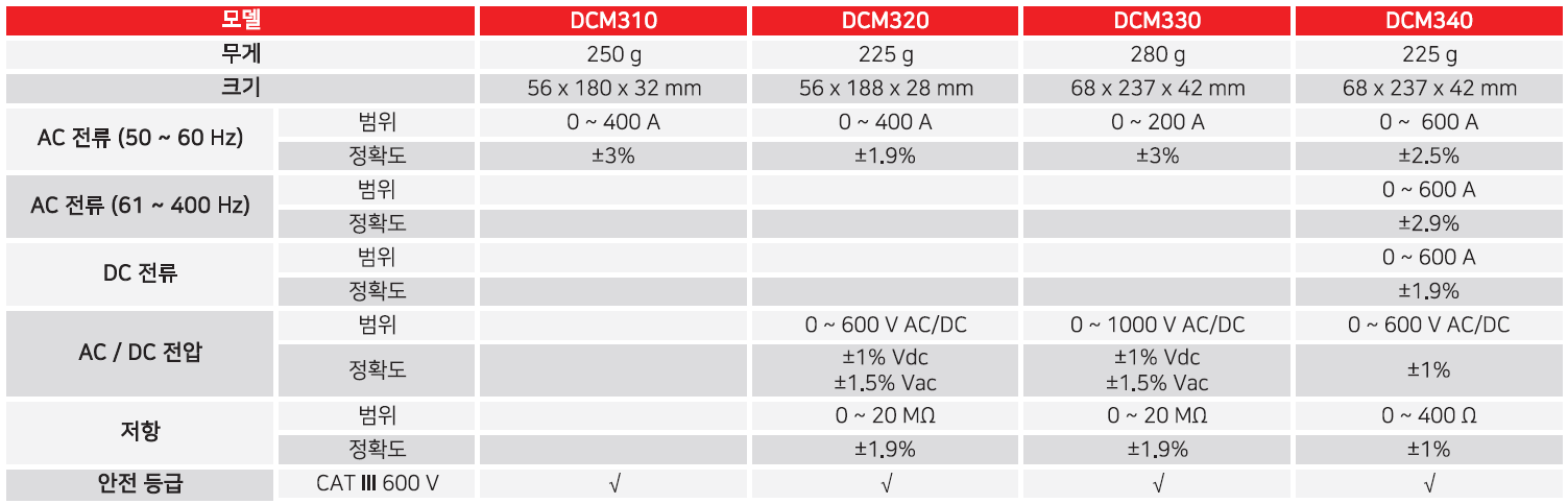 DCM340은 AC 또는 DC 전기 시스템 및 장비의 설치, 유지 보수, 모니터링 또는 점검에 사용하기에 이상적입니다.