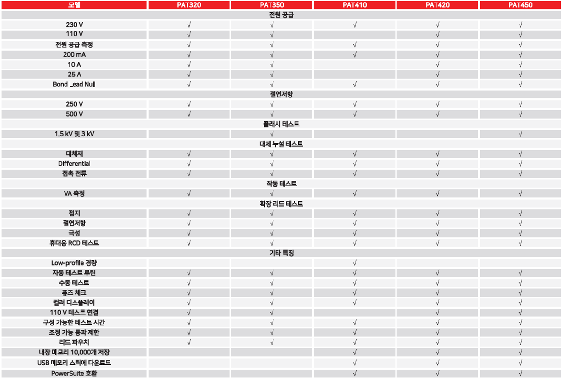 PAT series는 5가지 모델로 출시되었습니다. 기본 모델인 PAT320은 200mA, 10A, 25A 범위의 EARTH BOND TEST를 지원하며 PAT350은 FLASH TEST를 지원합니다.