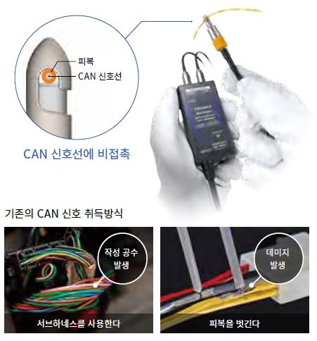 서브하네스를 제작하거나 케이블 피복을 벗겨내지 않고 CAN 신호를 취득할 수 있어 시험 준비에 걸리는